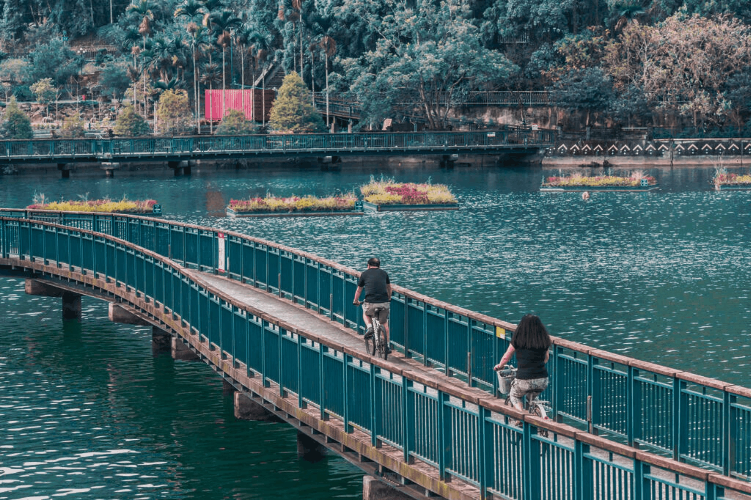 騎乘日月潭最經典的「向山段」自行車道,全長 3.4 公里,木棧道貼著水面而行,能將湖景盡收眼底。接續可搭乘渡輪或巴士至玄光碼頭,登上半山腰的玄奘寺。