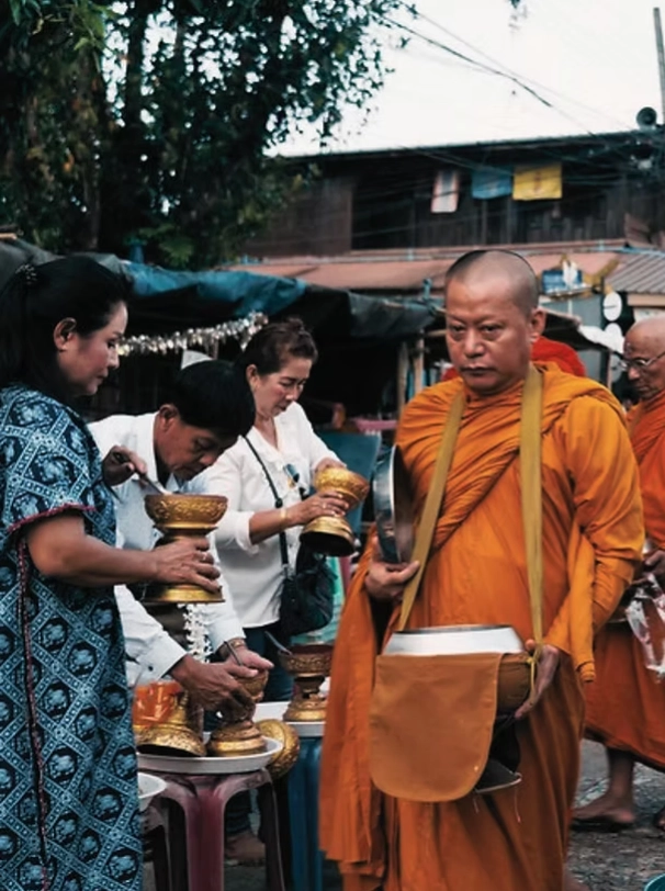 每天早上5點至7點之間,當地僧侶們會出來托缽化緣,接受民眾的佈施,這也是他們這一整天的食物來源。這些僧侶們穿著藏紅花色的長袈裟,並且赤腳行走在人行道上,一眼就能辨認出來。此時當地人排隊提供糯米飯等食物給僧侶們,而僧侶們則會施以祝福來回報。