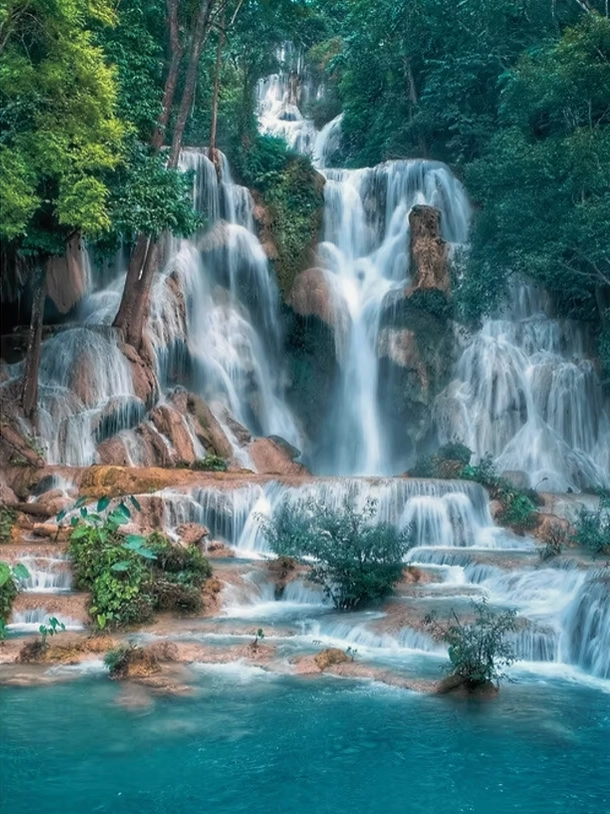 是寮國最壯麗的天然瀑布, 層層疊落形成碧藍夢幻的天然水池。 清澈沁涼的泉水與翠綠森林相映,讓旅人彷彿置身仙境。