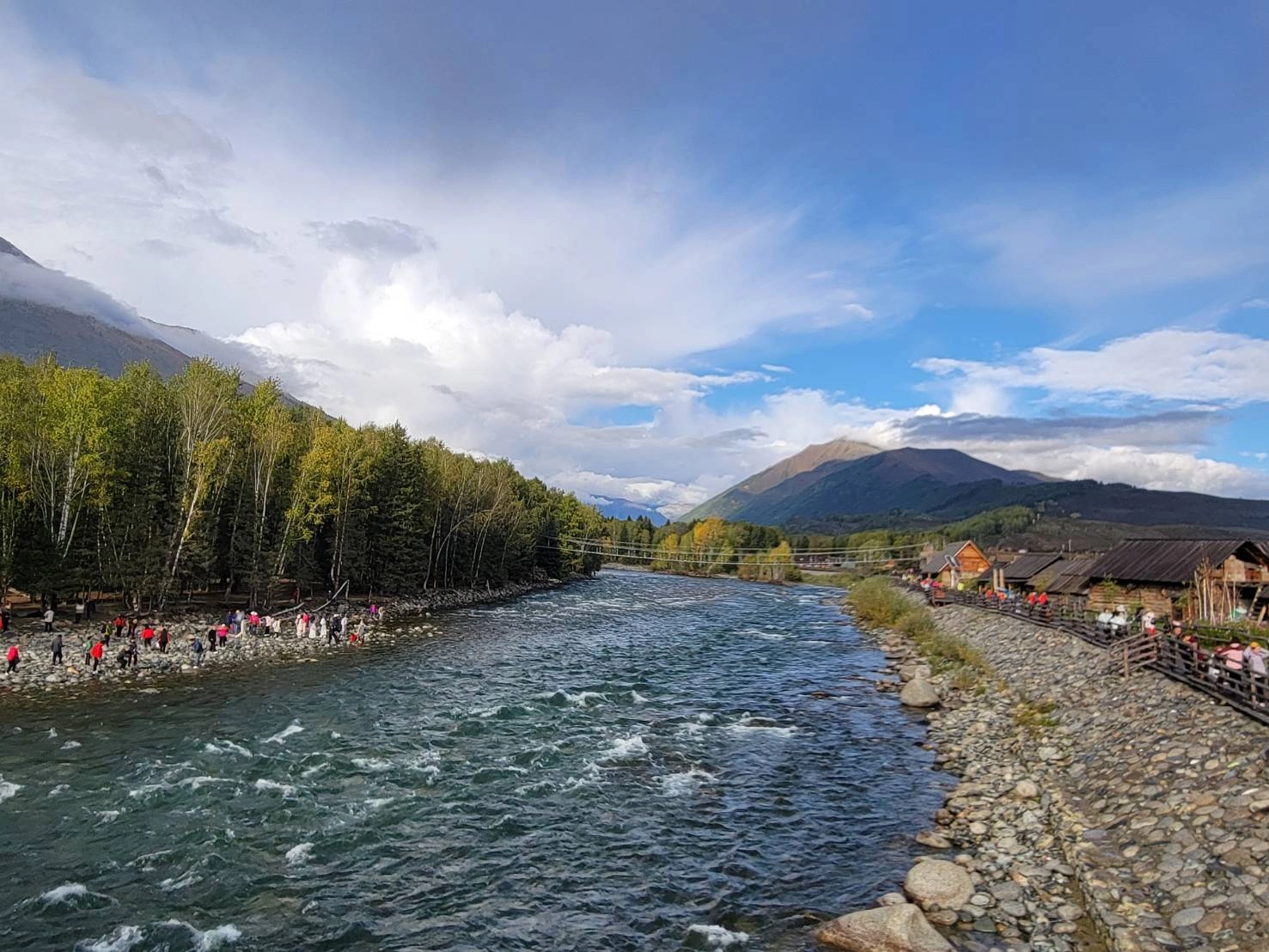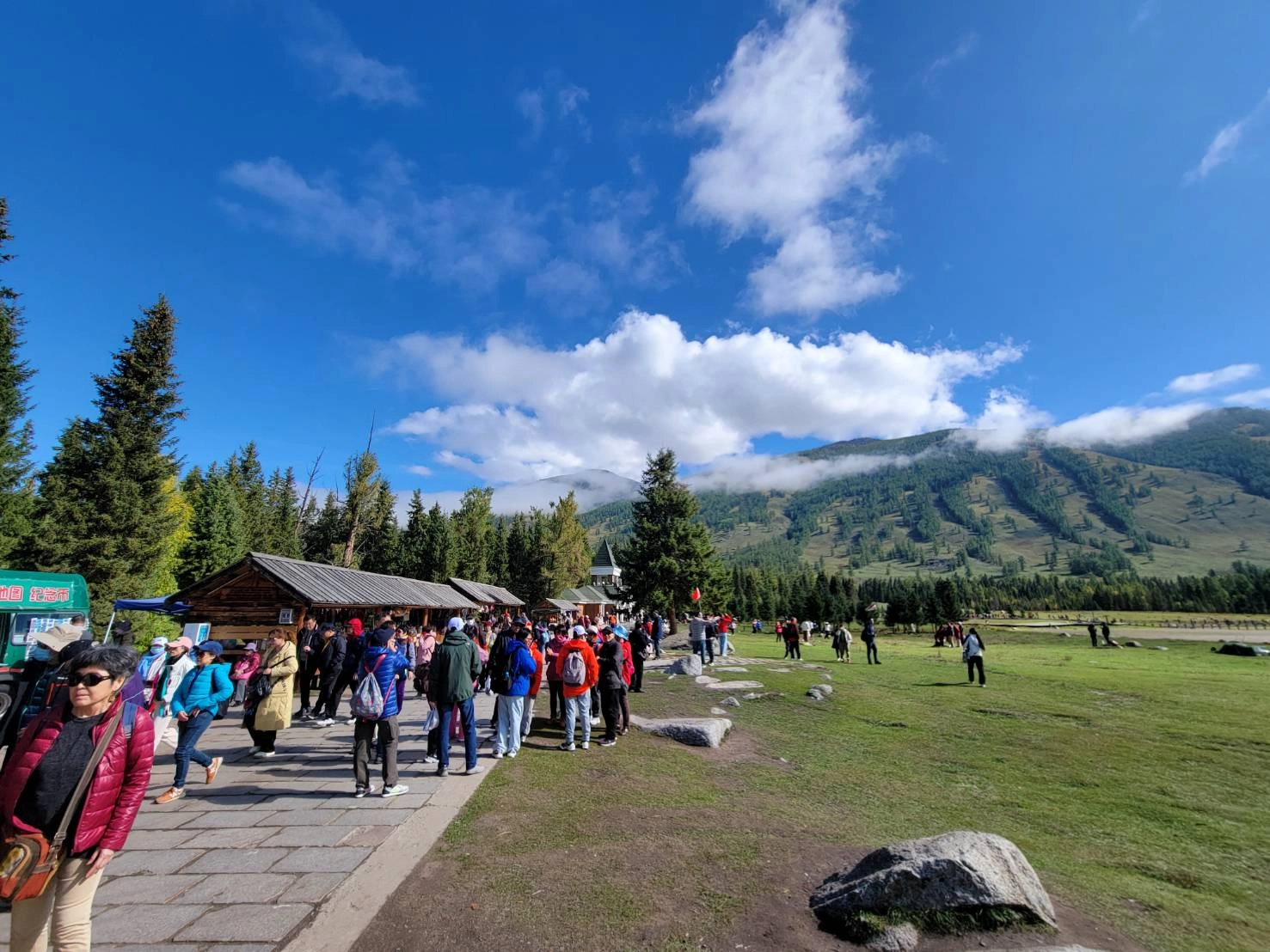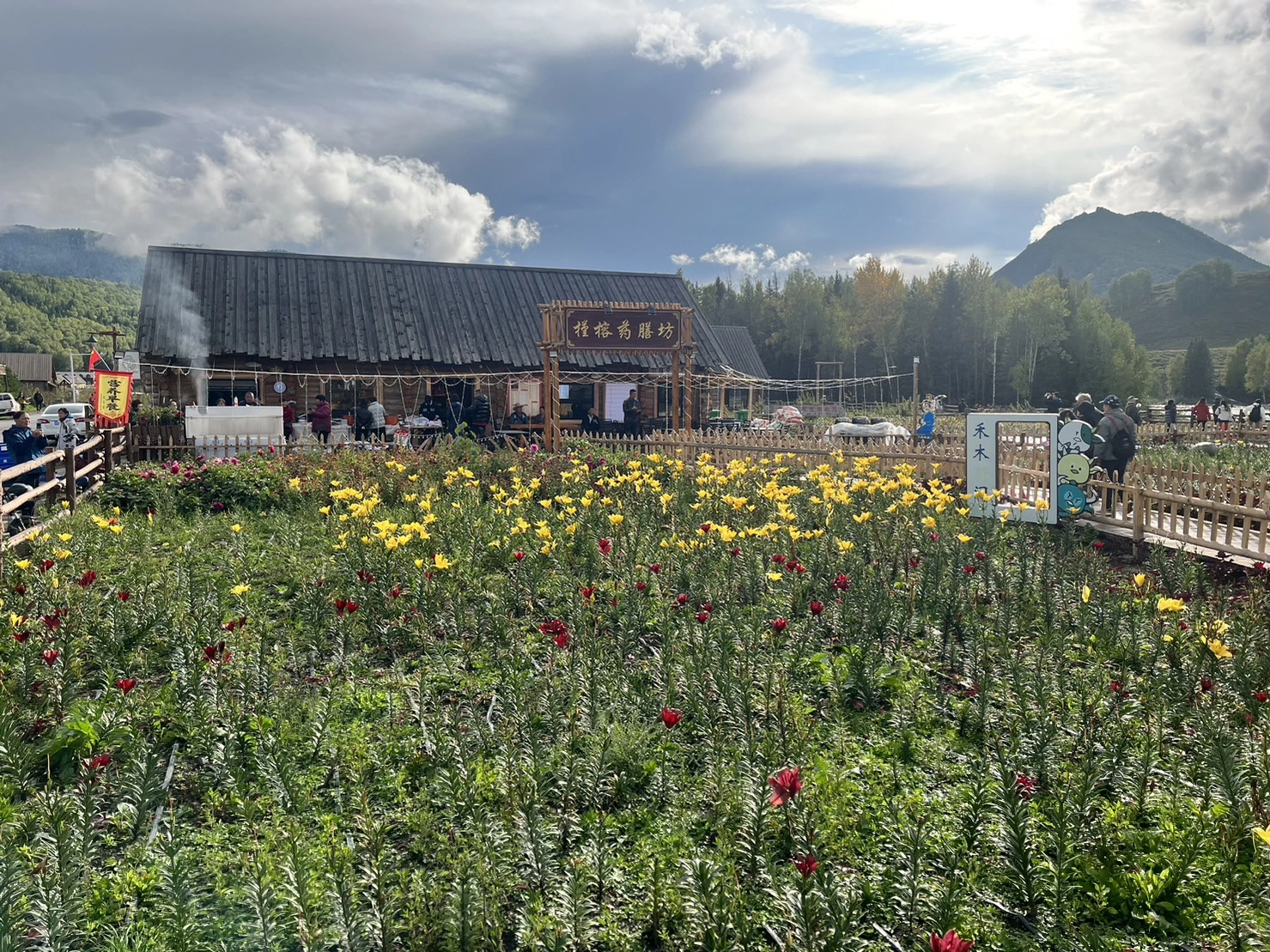 過往是個人跡罕至的小村莊,被發現後,境內清澈淙淙河水,環繞山谷而建的木屋,加上陣陣炊煙及飄渺雲霧,立即驚艷各界。初秋的禾木,滿山矗立白樺林,逐漸由綠轉為青黃,屋前盛開的小黃花,仍在抓住生命最後力道綻放著,原本靜謐氛圍讓人猶如置身在油畫裡,隨著造訪遊客暴增,小村變得紛雜有些失序,引起重視。另外,因事制宜的人為元素,天空步道也出現了,不過遊客們還是喜歡走木棧道。