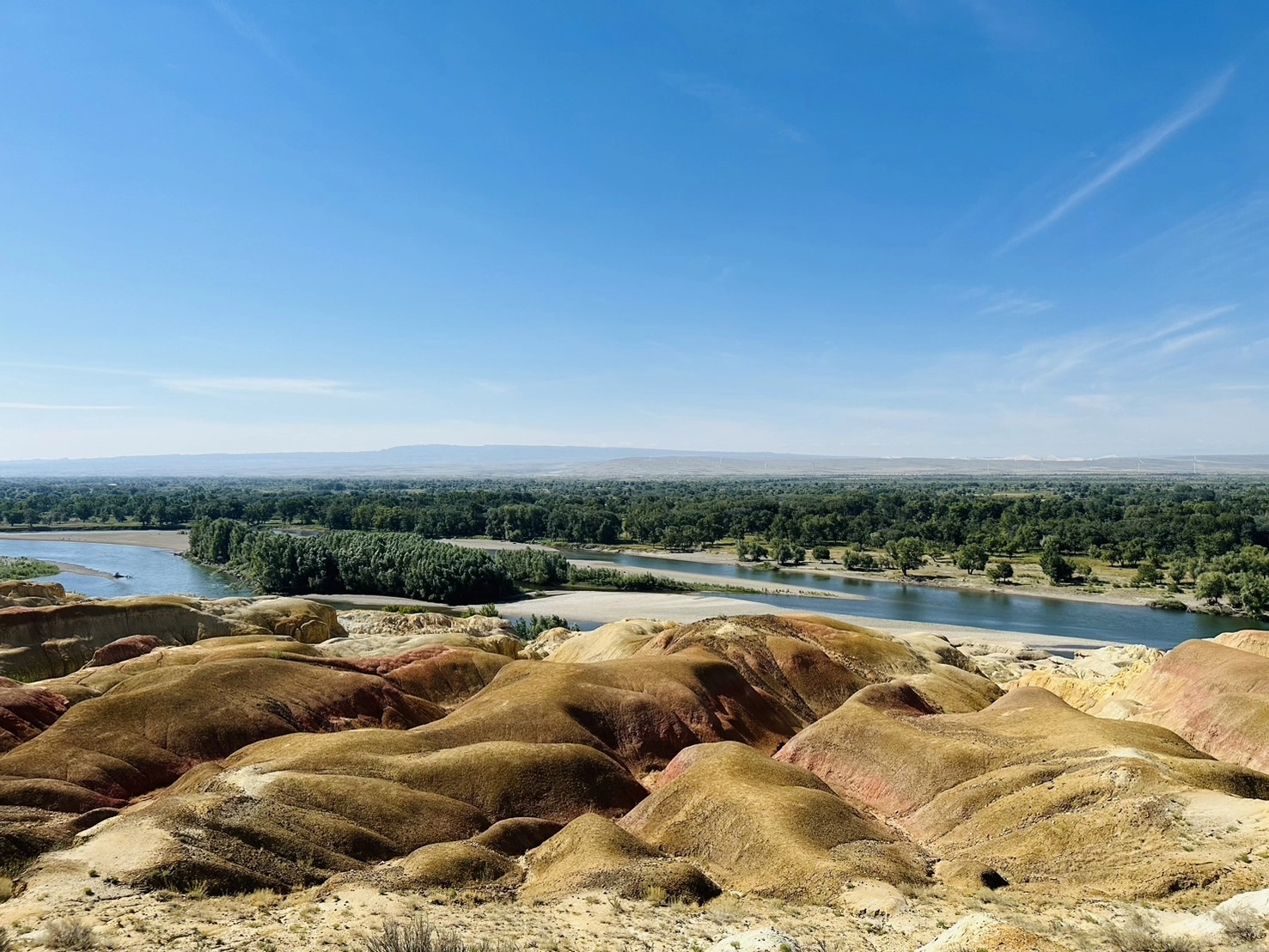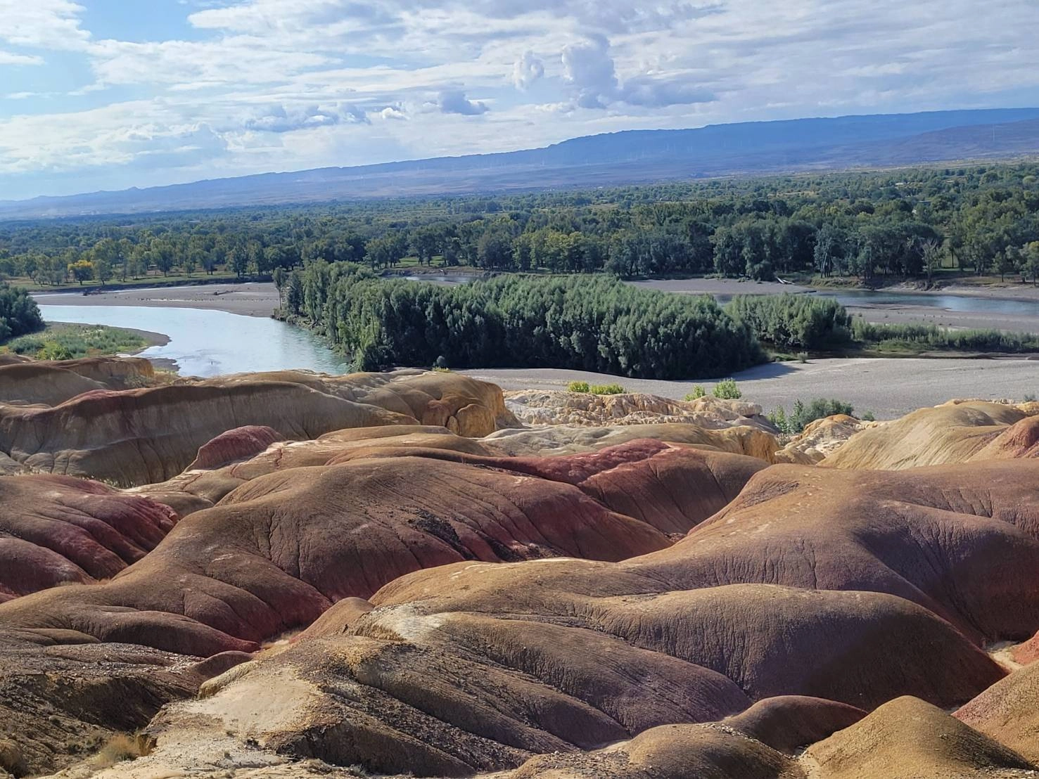 來到五彩灘,典型雅丹地質經由光合催化,形成大小不一緊密連接的岩石土丘,在陽光煦射下,呈現或紅或黃或褐或咖啡......等斑斕色彩,而有地上彩虹封號,也令人對大自然鬼斧神工傑作虔敬讚佩。