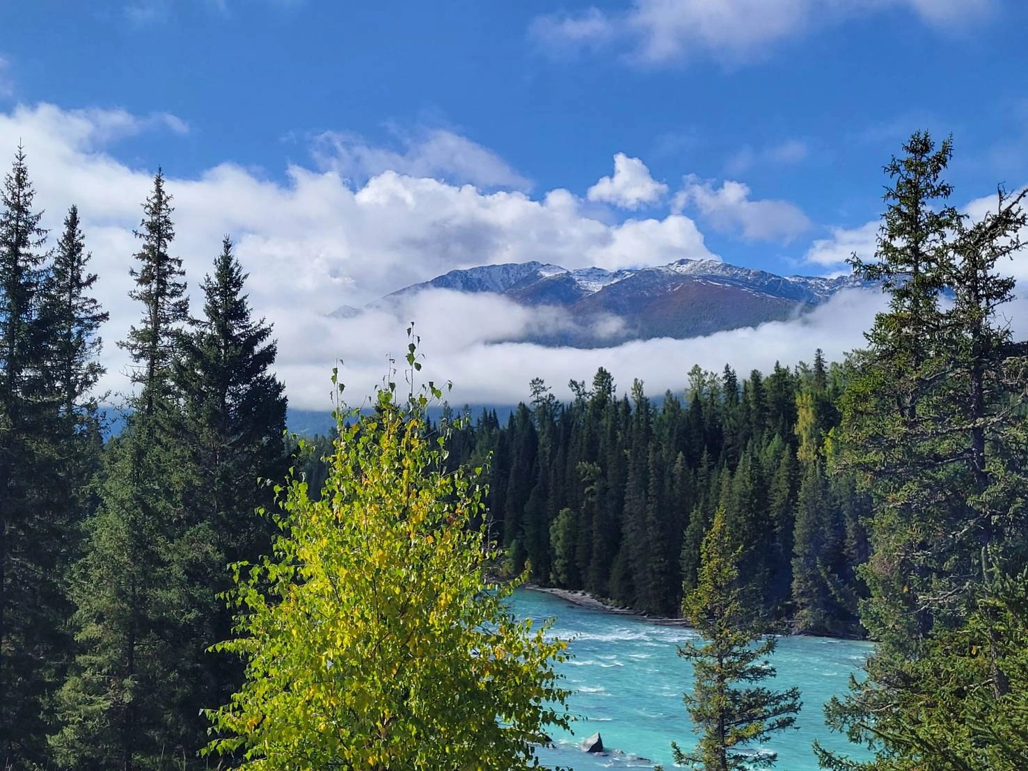 發源於阿爾泰山的禾木河,由東北向西南貫穿,蜿蜒經過蒙古邊界,與喀納斯河匯聚,成為布爾津河。當地人認為禾木河守護孕育禾木村,世代能夠安居,故以虔誠崇敬之心視為母親的河。