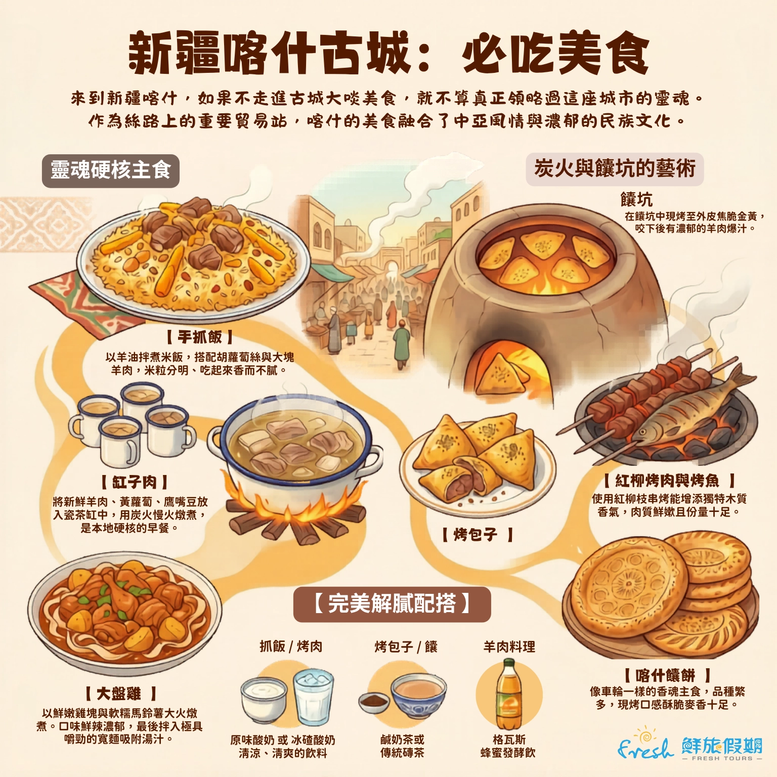 南疆美食多以牛羊肉為主,以「重油、重肉、重香料」聞名,對習慣清淡飲食的遊客來說負擔較重。強烈建議隨餐飲用磚茶或格瓦斯(酒精含量極低的發酵飲),這能有效去油解膩並預防消化不良。此外,喀什的涼菜「辣度」極高,點餐前請先確認自己的耐辣程度。
