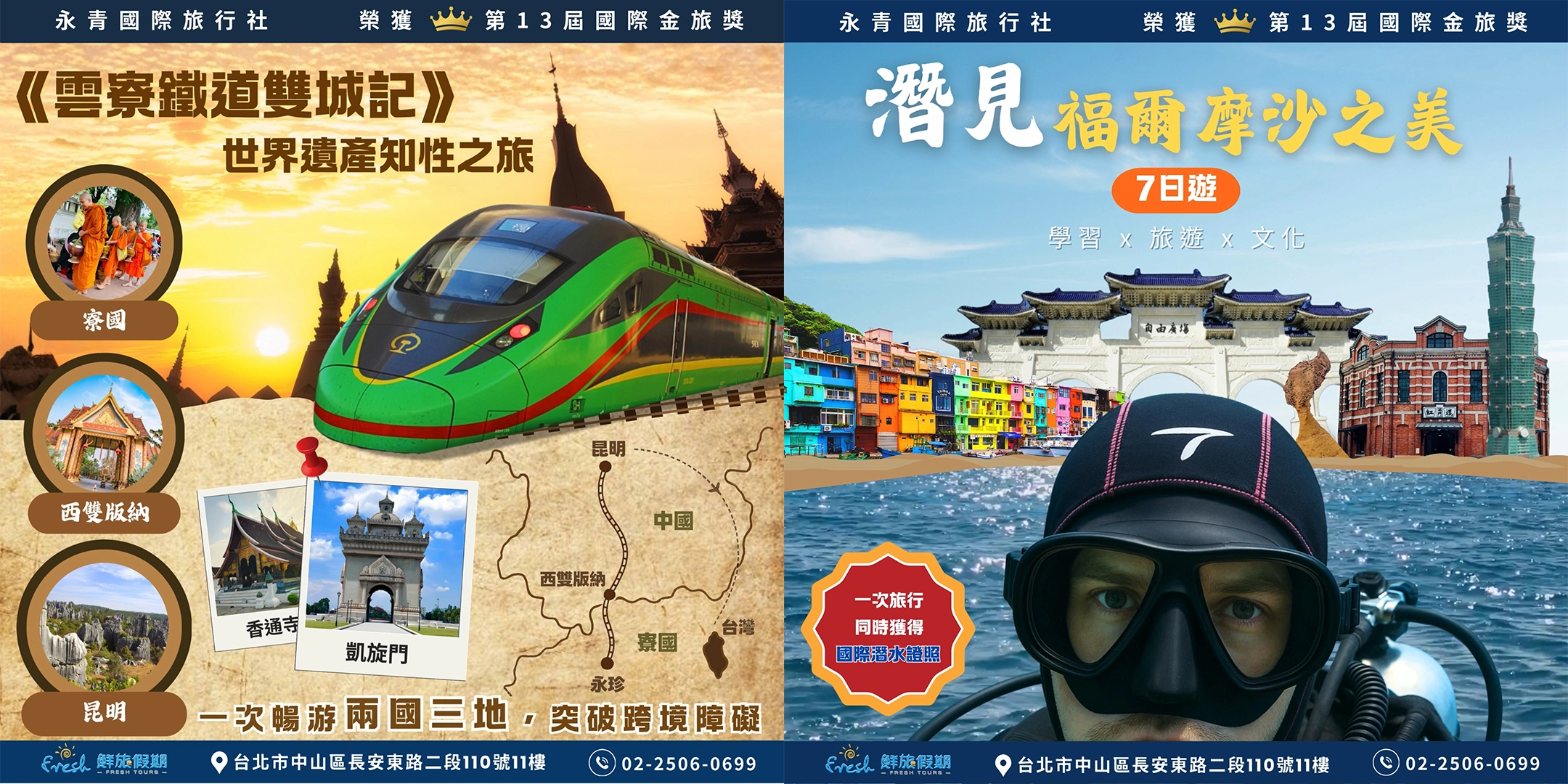 - 【雲寮鐵道雙城記・世界遺產知性之旅】(出境旅遊類金旅獎): 串聯中寮鐵路、西雙版納與寮國,以美學鐵道穿梭世界遺產,品味雙國精彩。